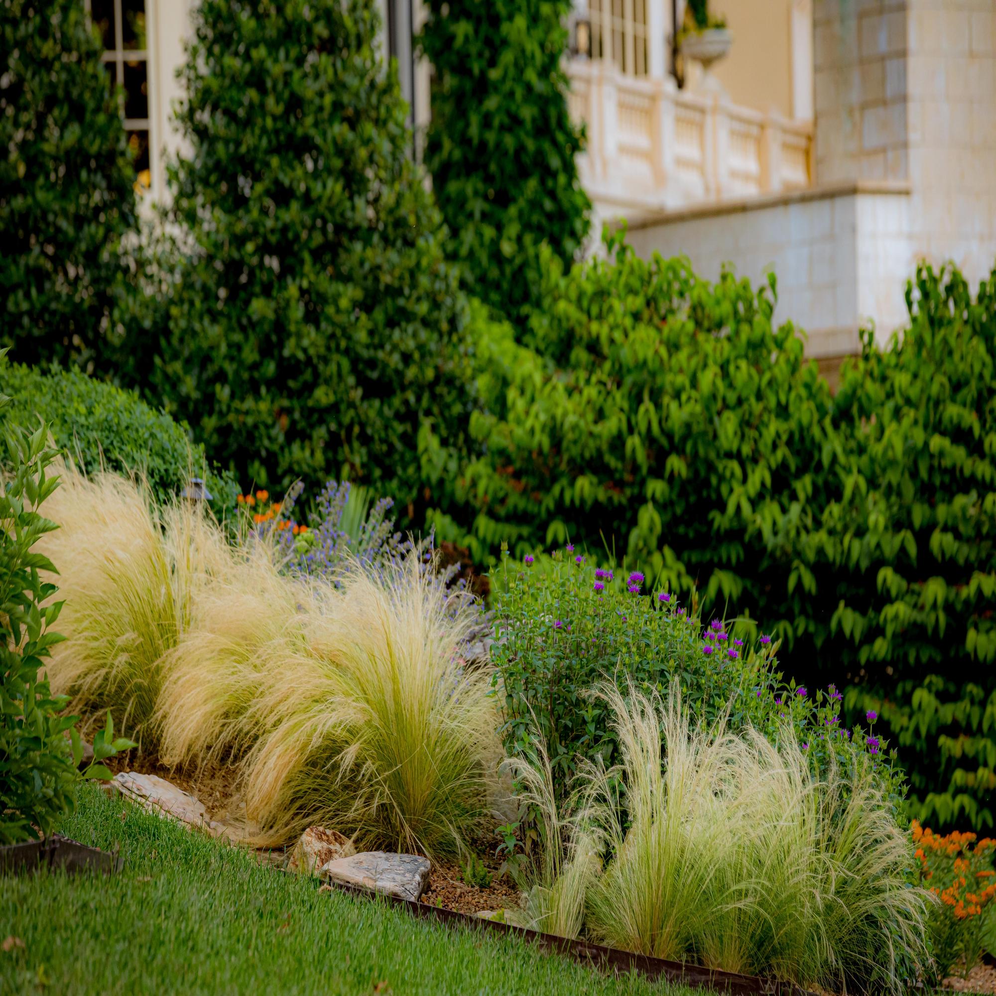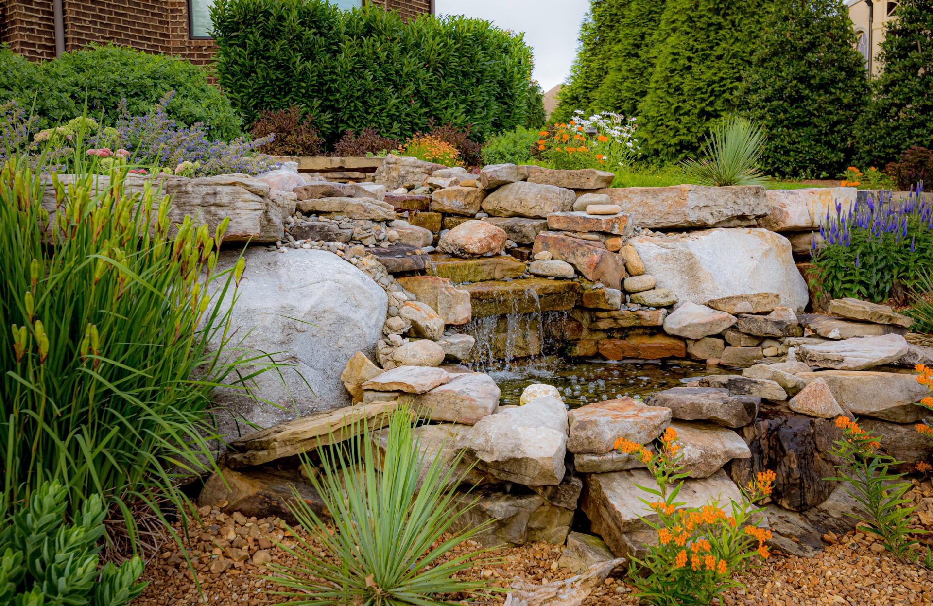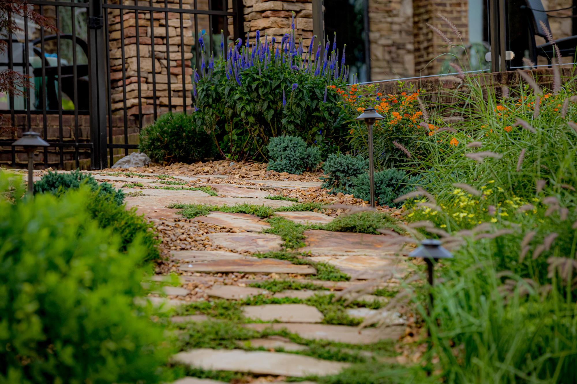 This property is a plant enthusiast’s paradise. This project features lush trees, sweeping softscapes, and a variety of florals handpicked for the homeowner and their love for variety. Our team added a creek to give the property dimension and visually transition the home into the existing landscape.